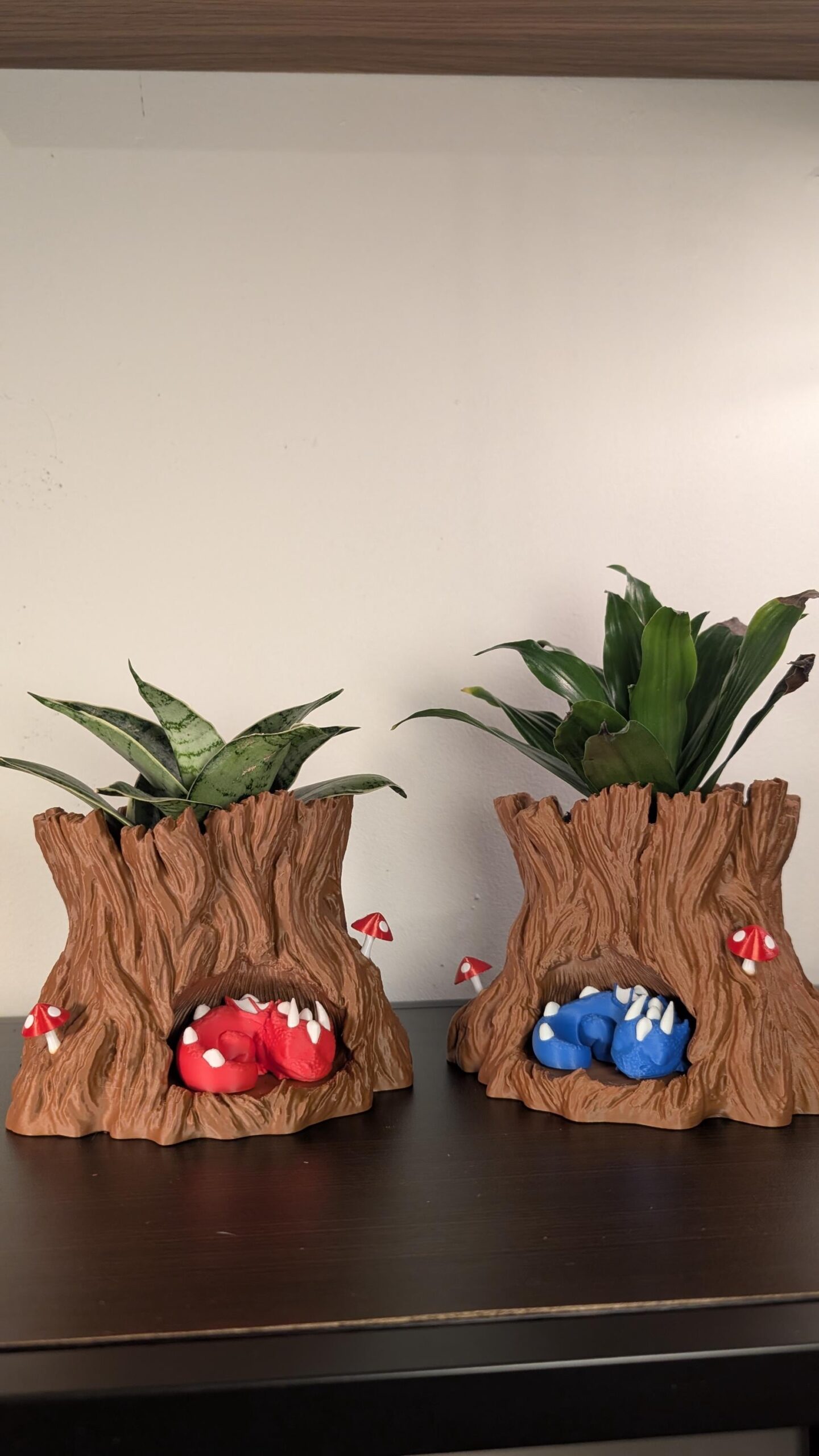 Step into a world of charm and wonder with this enchanted tree stump planter, a perfect blend of nature-inspired beauty and fantasy magic. At the front of the stump rests a small hollow, where a cute little dragon curls up for a peaceful slumber, bringing warmth and whimsy to your space. Adorning the stump are three bright red mushrooms with white spots, instantly evoking the charm of a mystical woodland scene. Whether gracing your windowsill, bookshelf, or garden nook, this planter brings a storybook touch to any home.