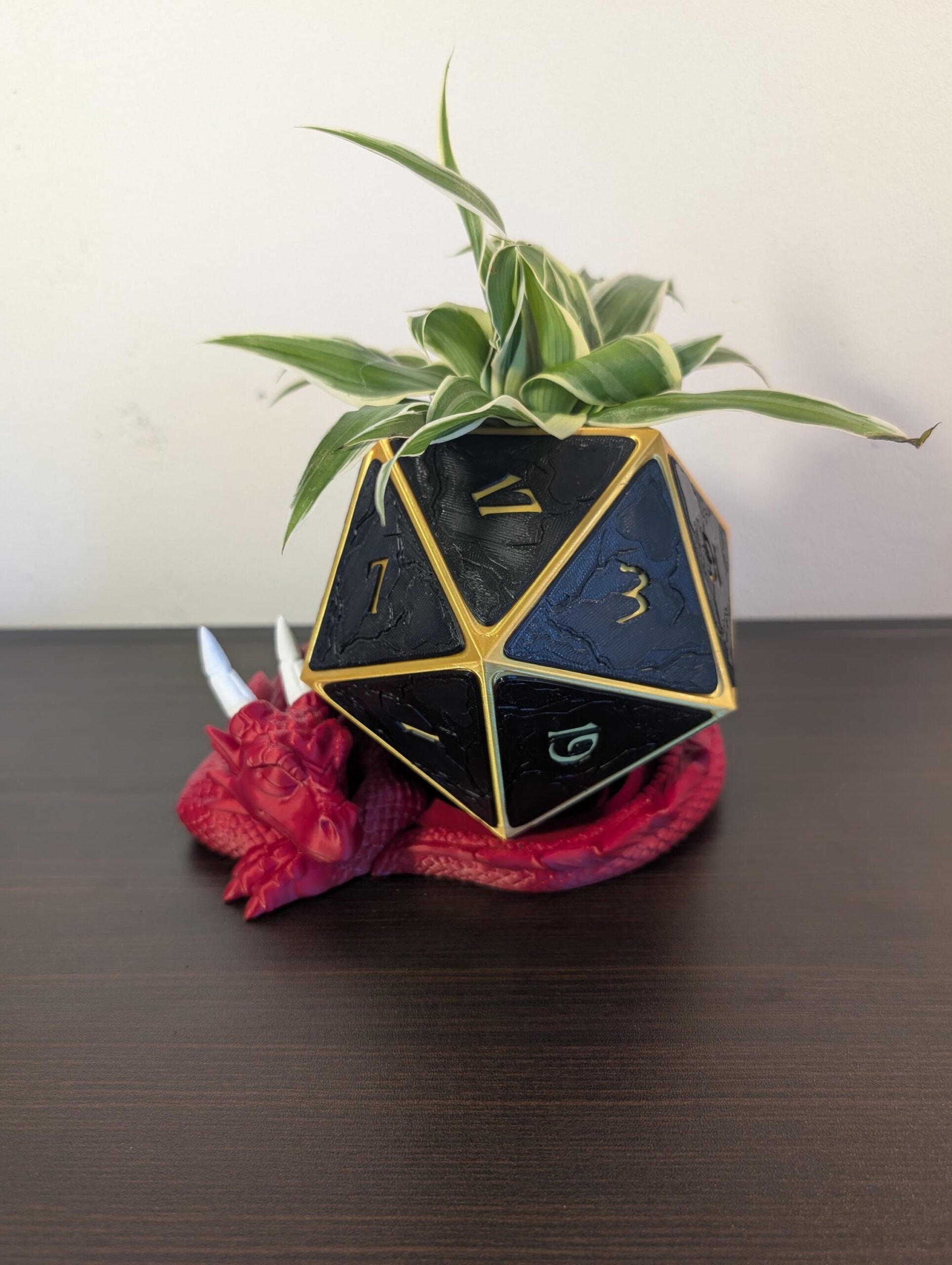 Bring your tabletop adventures to life with this epic Dragon D20 Planter – a must-have for any Dungeons & Dragons fan or fantasy enthusiast! This striking planter is shaped like a giant D20 die, featuring a shimmering gold core and sleek black number plates that give it a bold and powerful look. Resting beneath this iconic design is a sleeping dragon-shaped drip tray that not only catches excess water but adds an extra magical touch to your indoor plant setup.